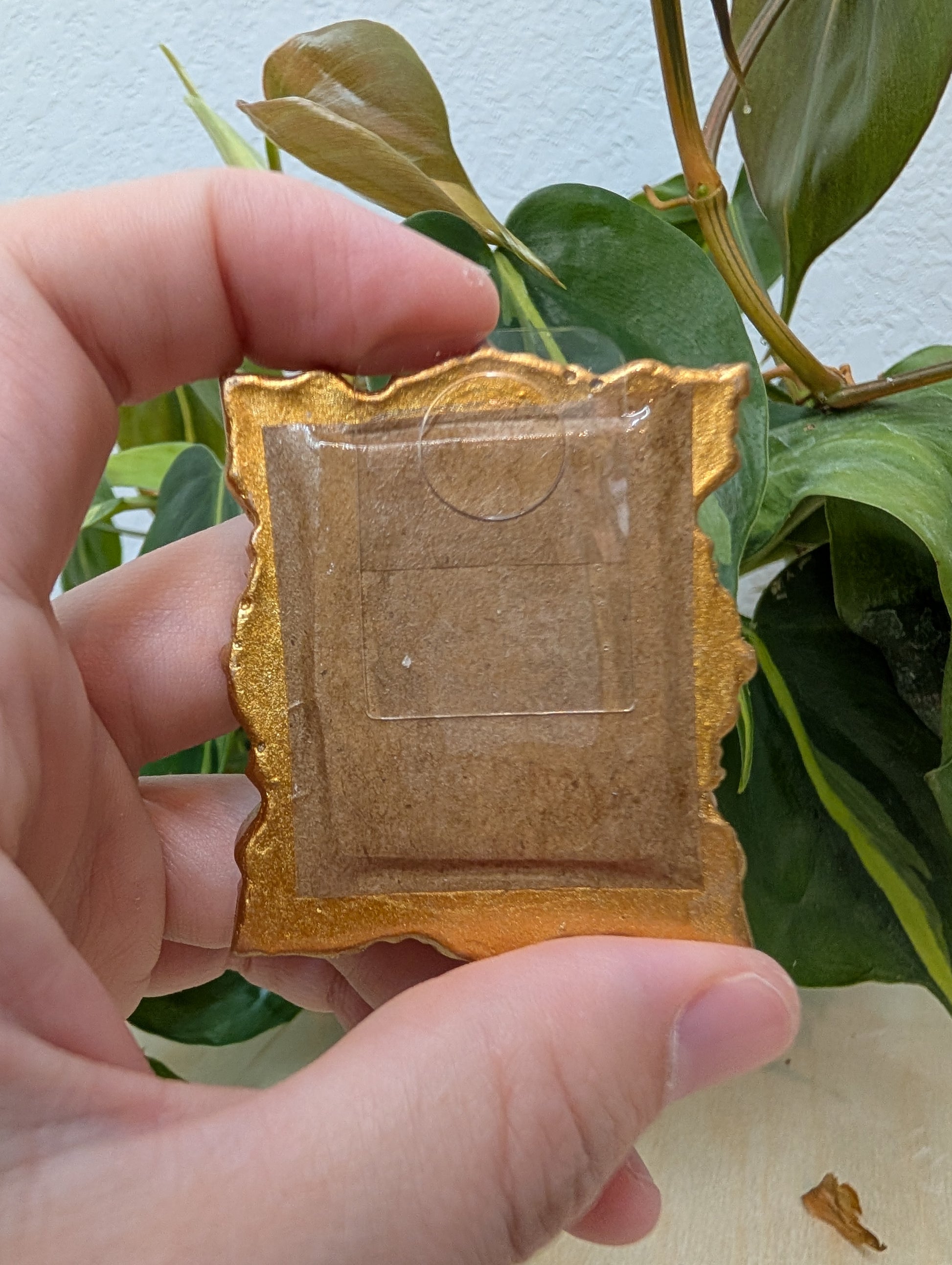 These make great gifts for any miniature enthusiast! It comes in the little gold frame, and has a tag hanger on the back.