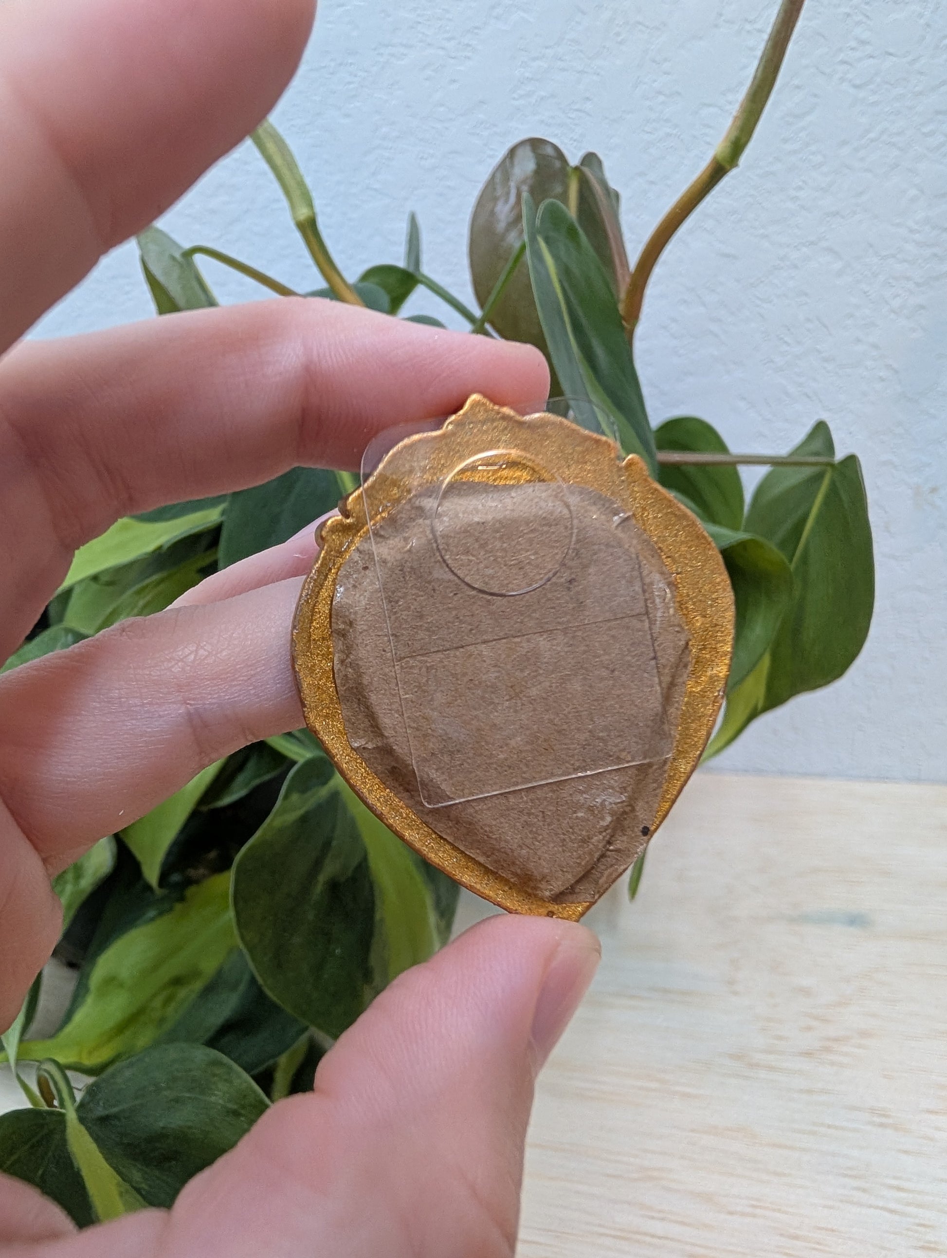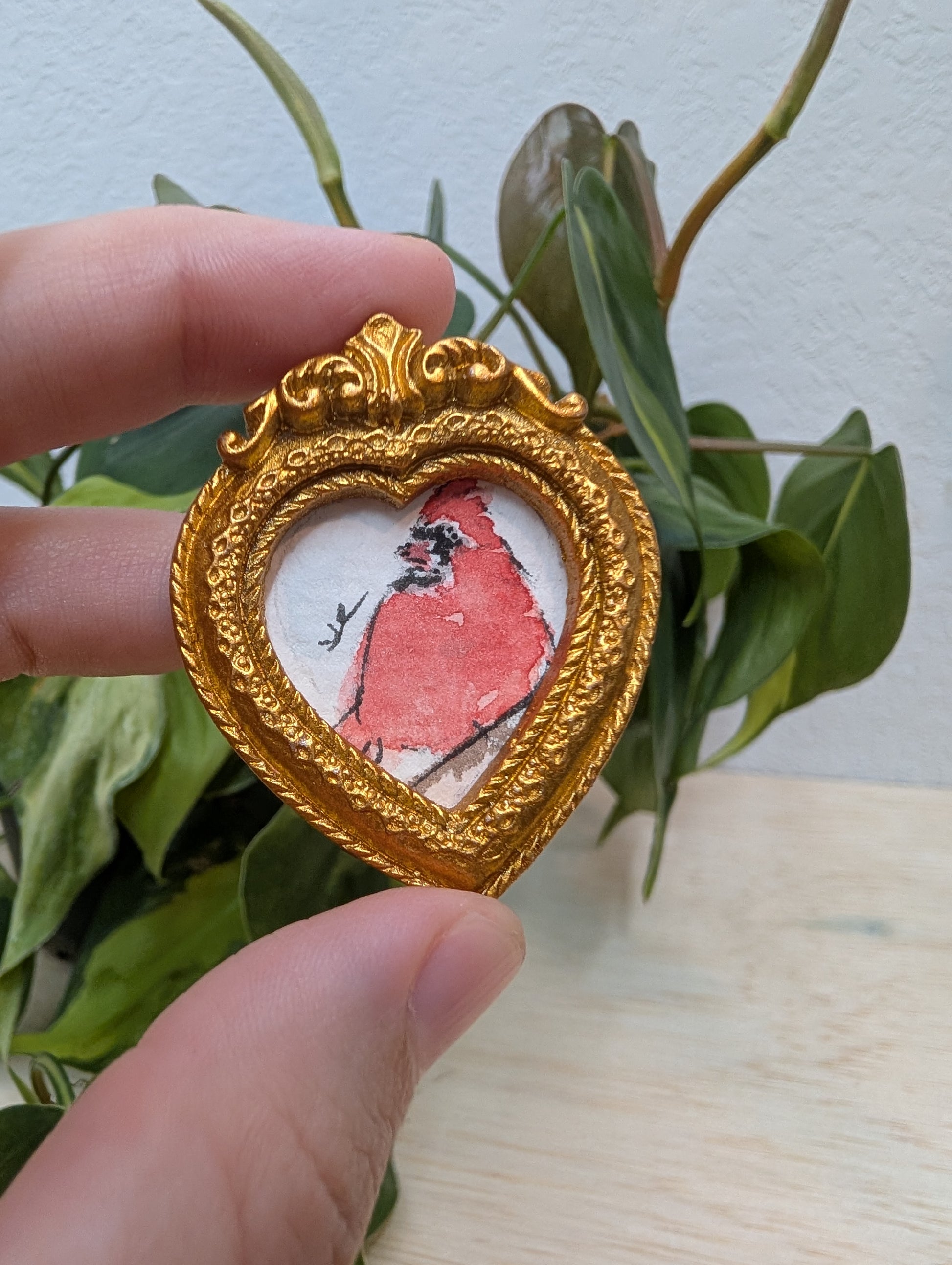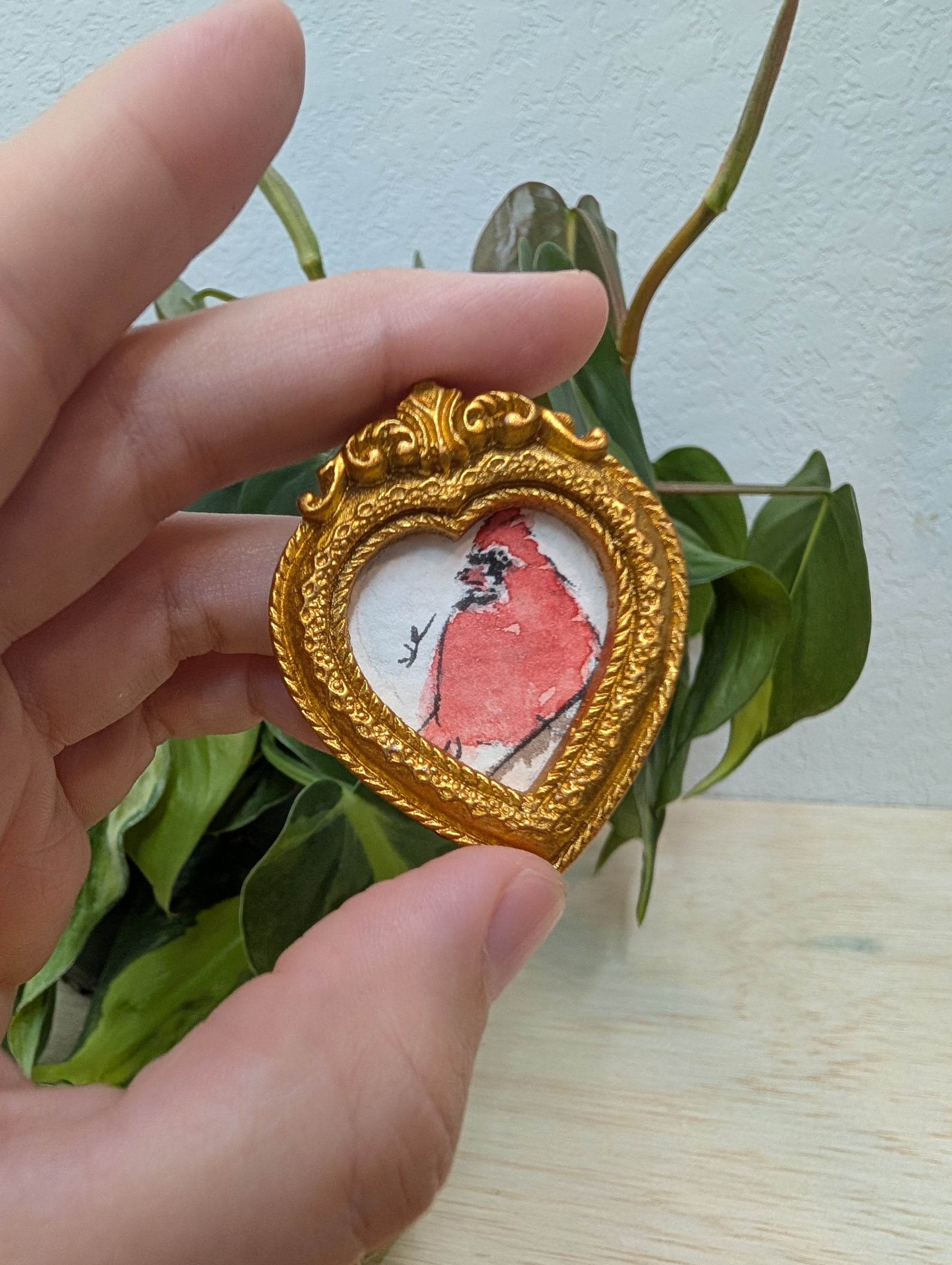 These make great gifts for any miniature enthusiast! It comes in the little gold frame, and has a tag hanger on the back.