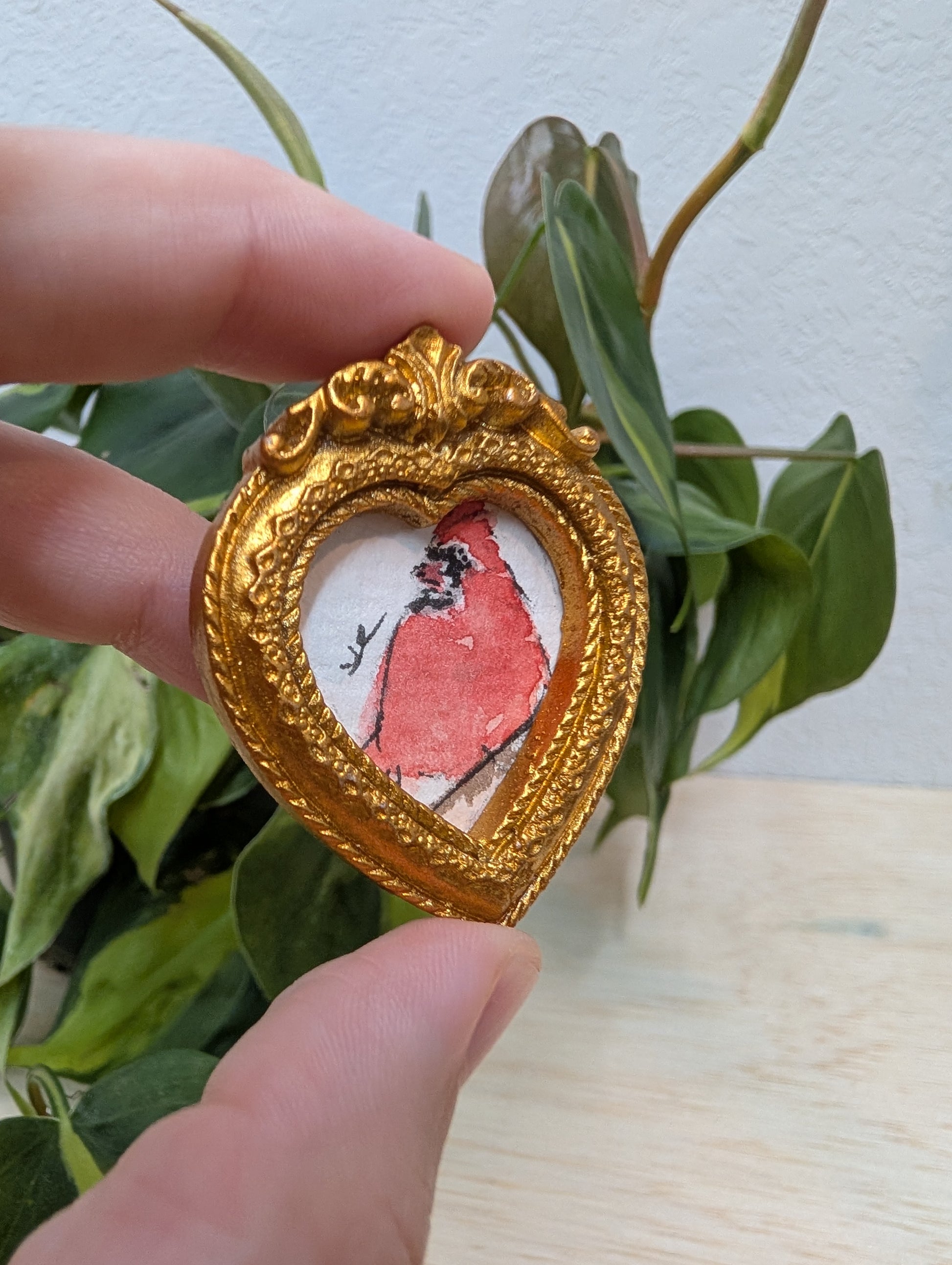 Mini Cardinal Bird Painting - Original Watercolor Art by Lora Cavallin