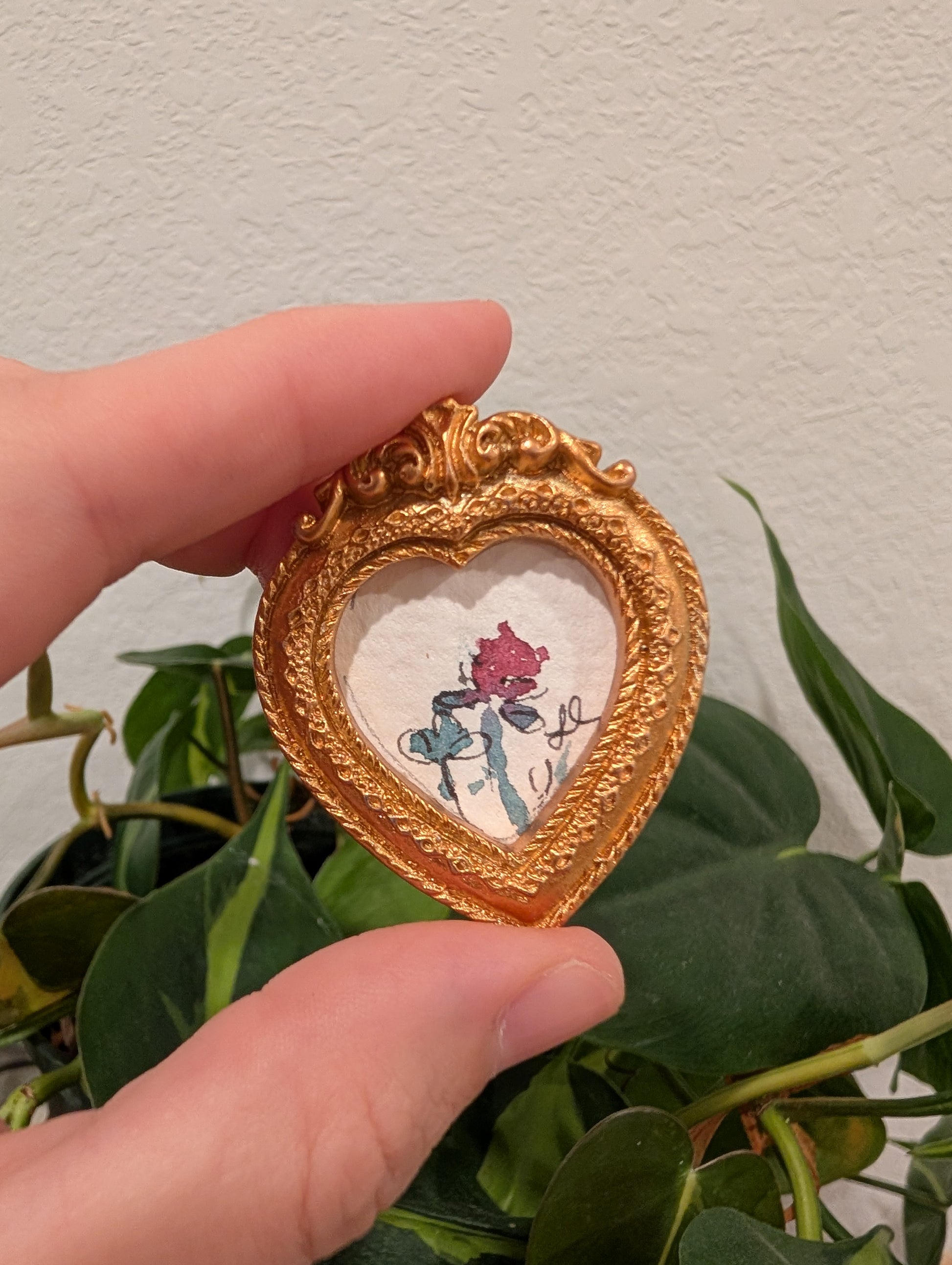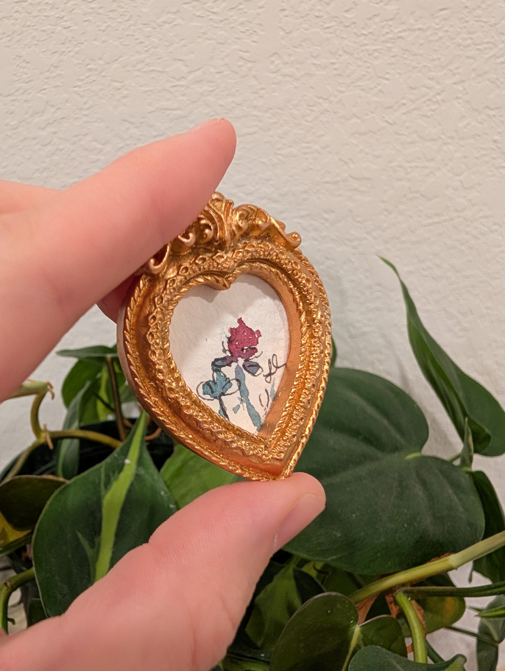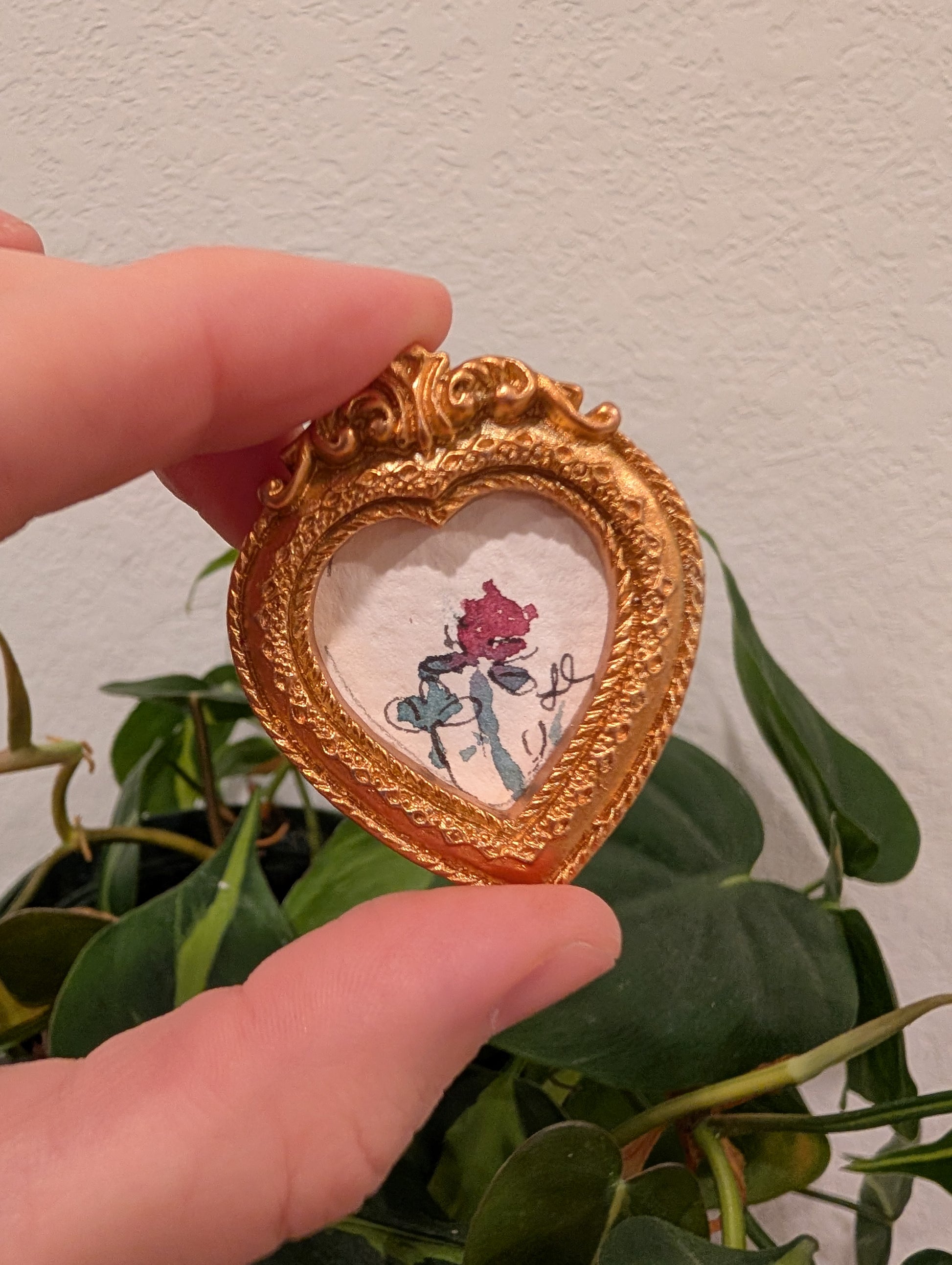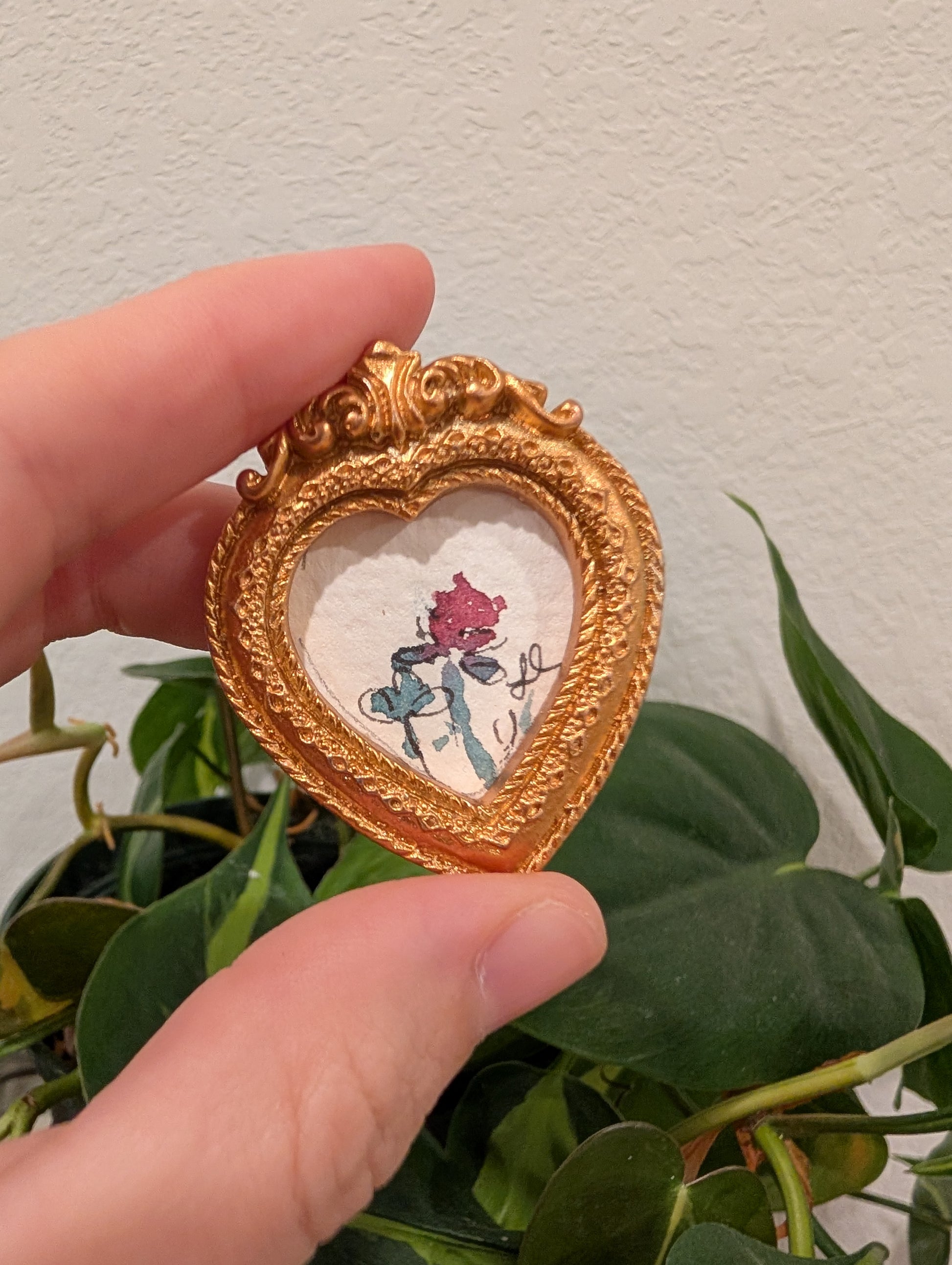 These make great gifts for any miniature enthusiast! It comes in the little gold frame, and has a tag hanger on the back.