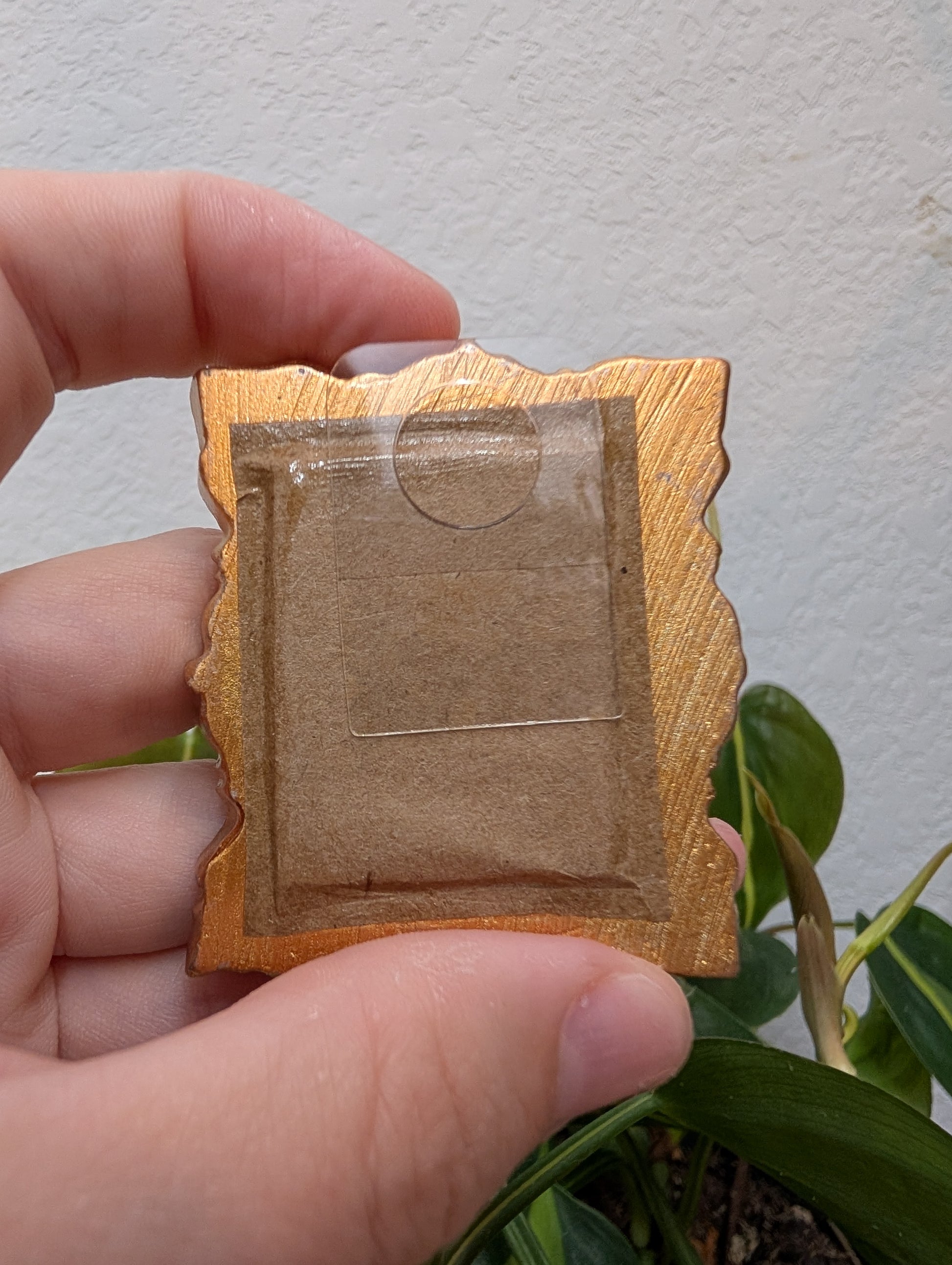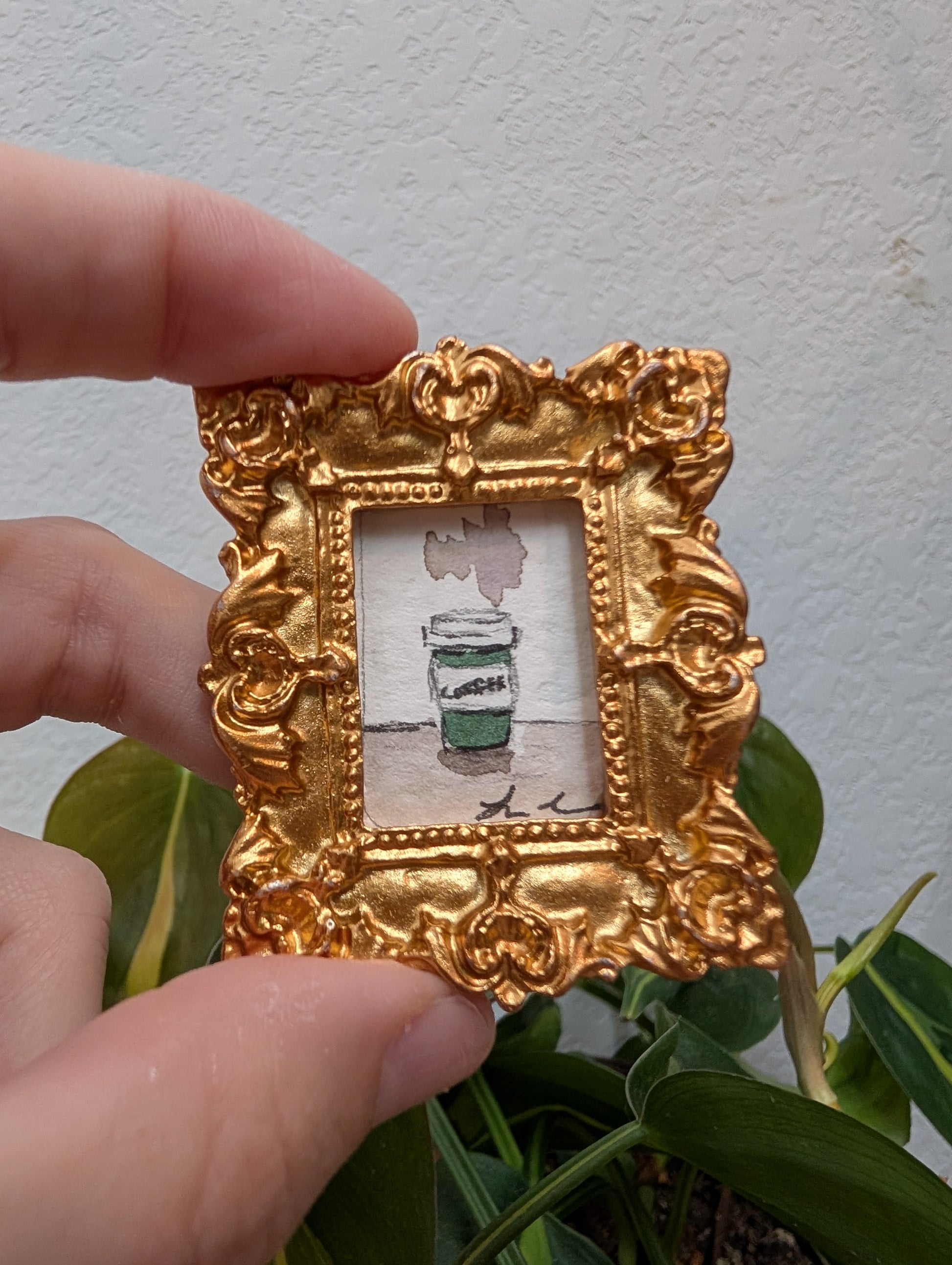 These make great gifts for any miniature enthusiast! It comes in the little gold frame, and has a tag hanger on the back.