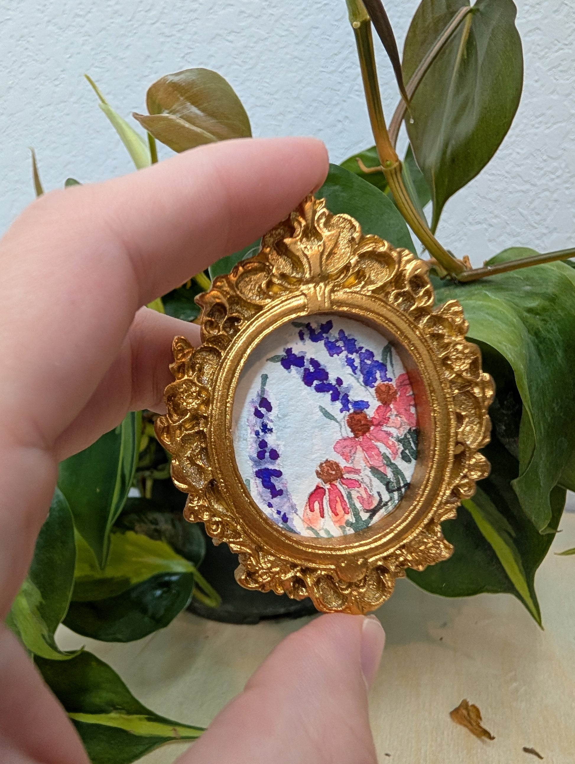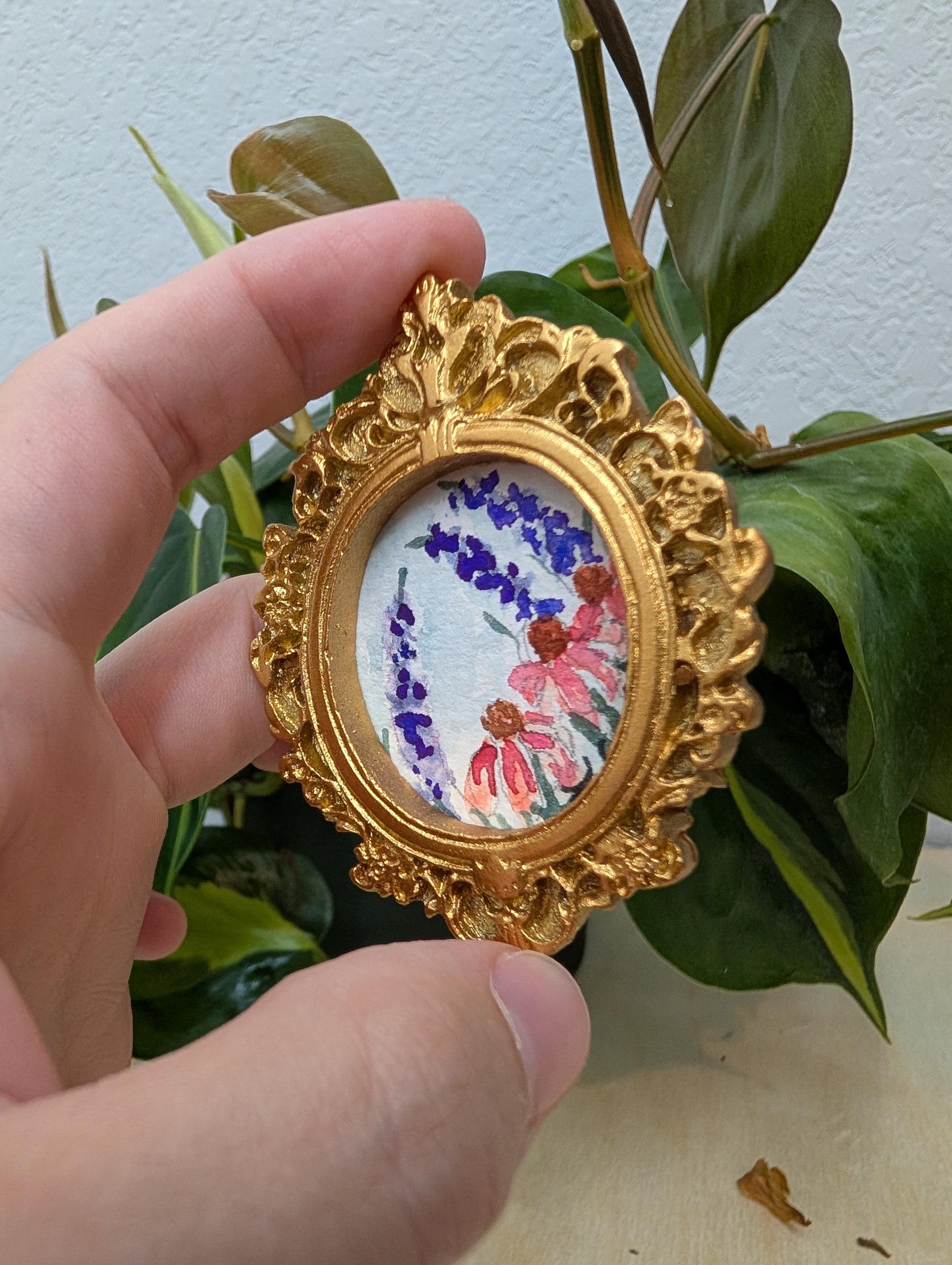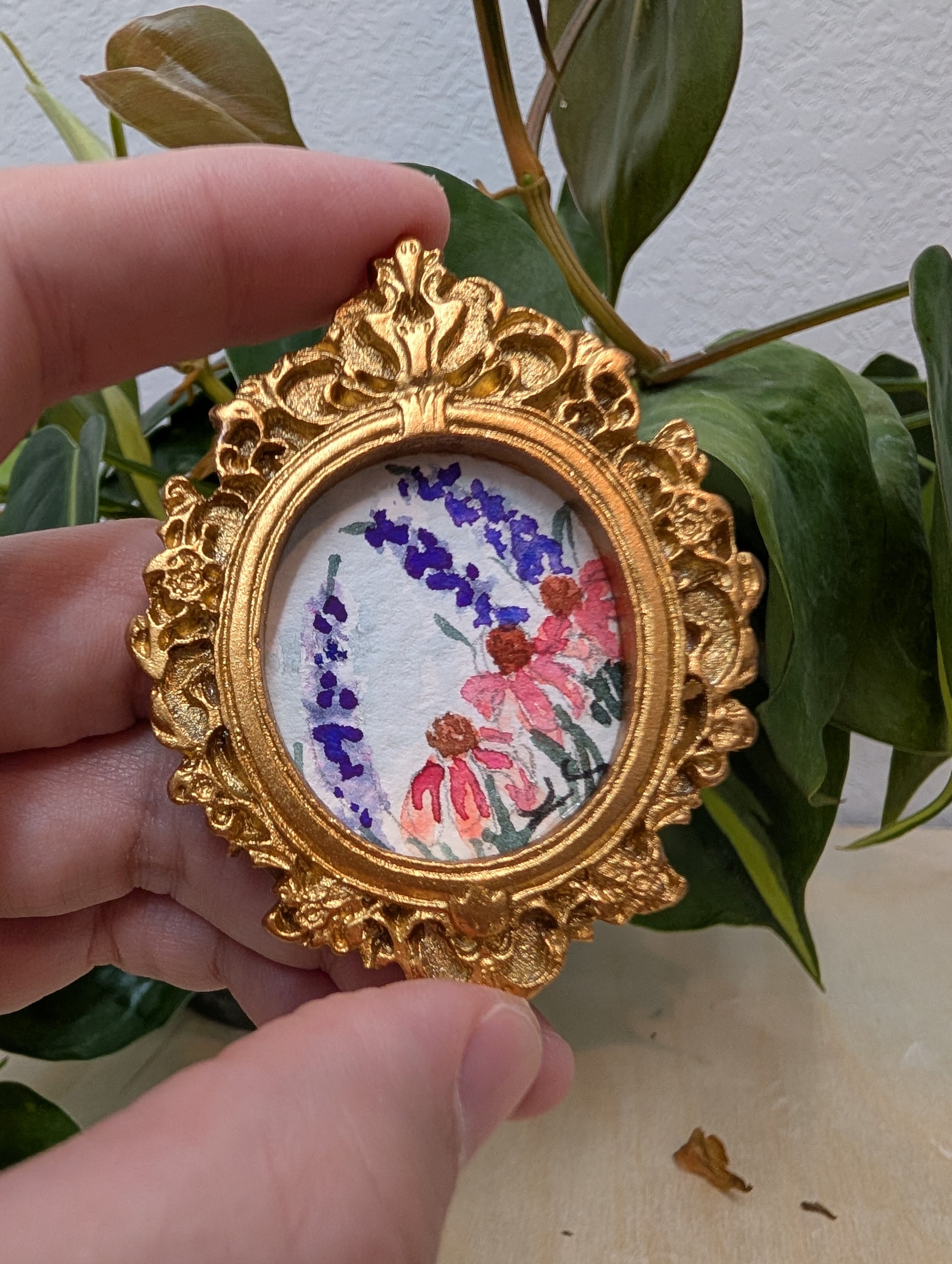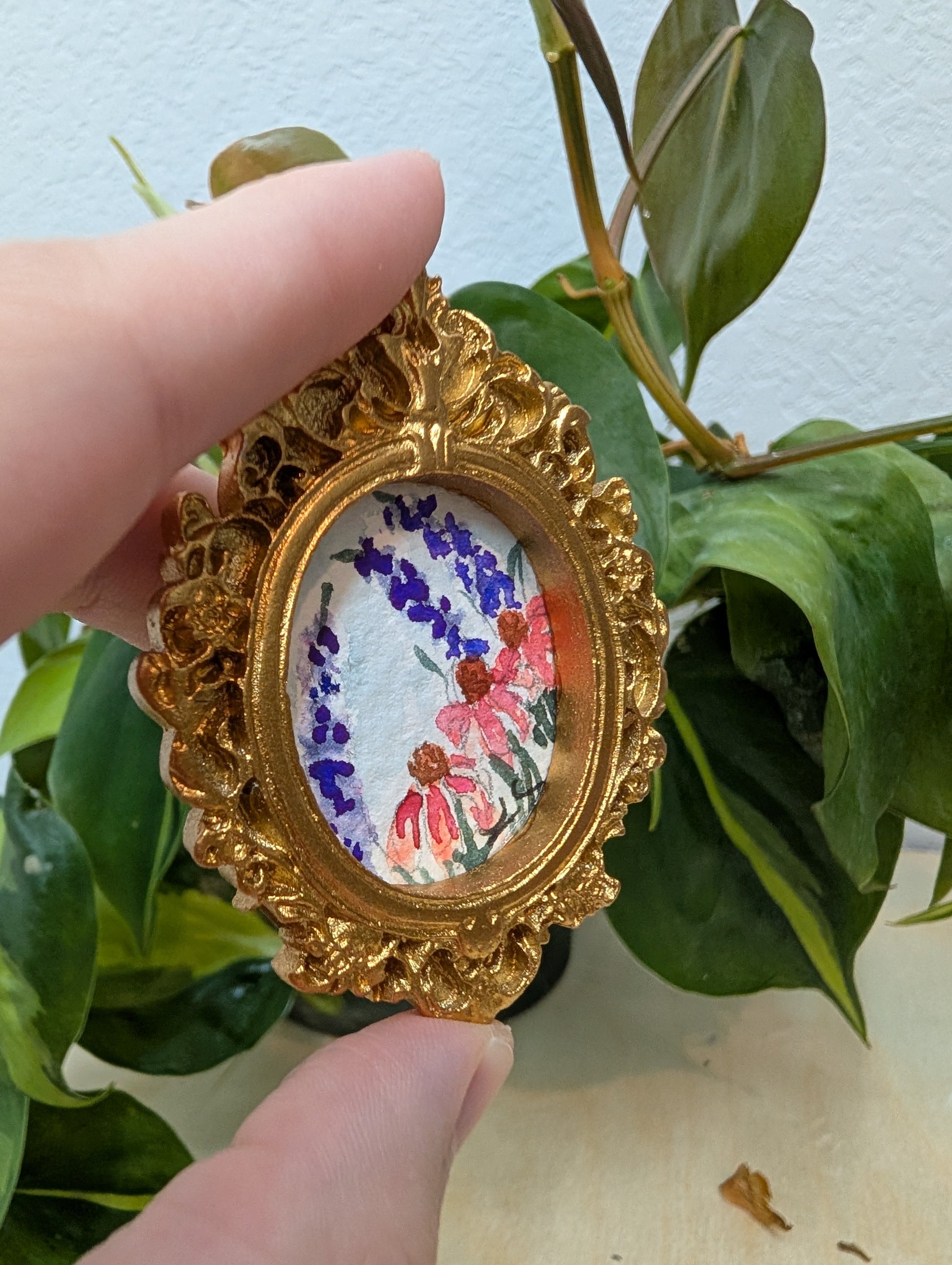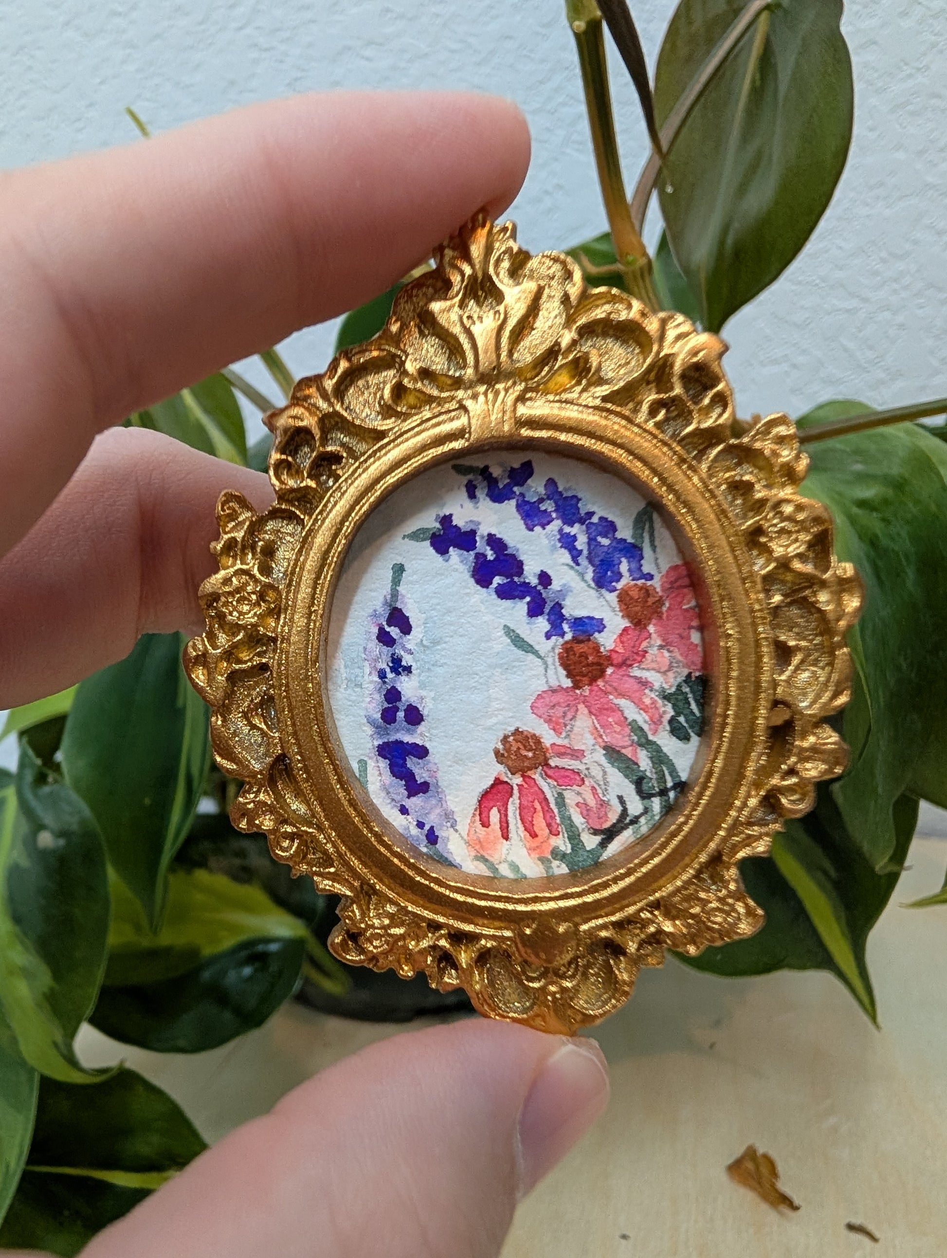 These make great gifts for any miniature enthusiast! It comes in the little gold frame, and has a tag hanger on the back.
