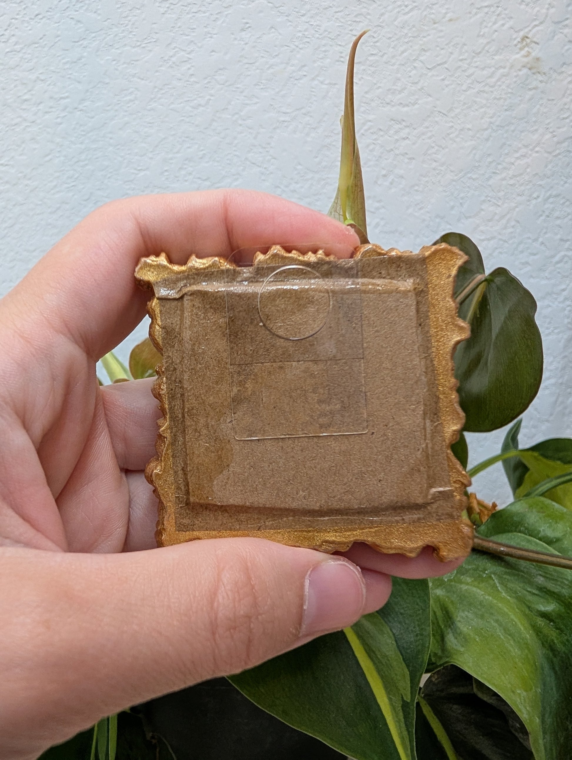 These make great gifts for any miniature enthusiast! It comes in the little gold frame, and has a tag hanger on the back.