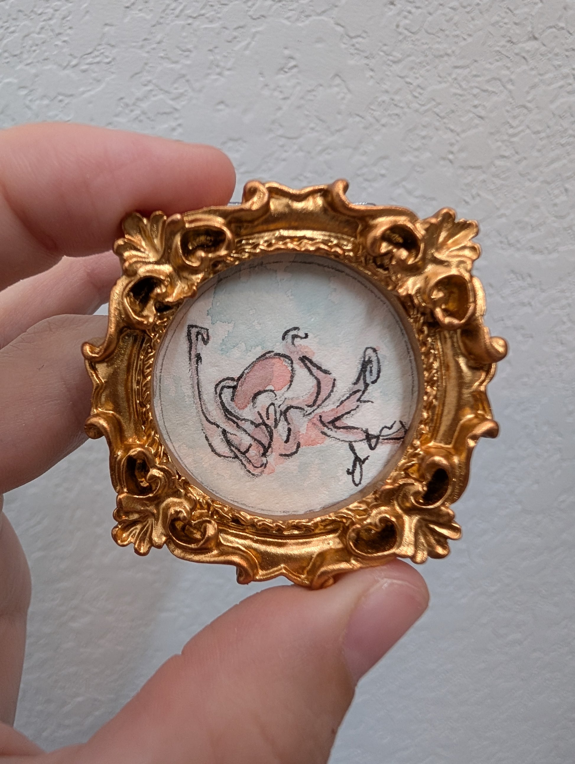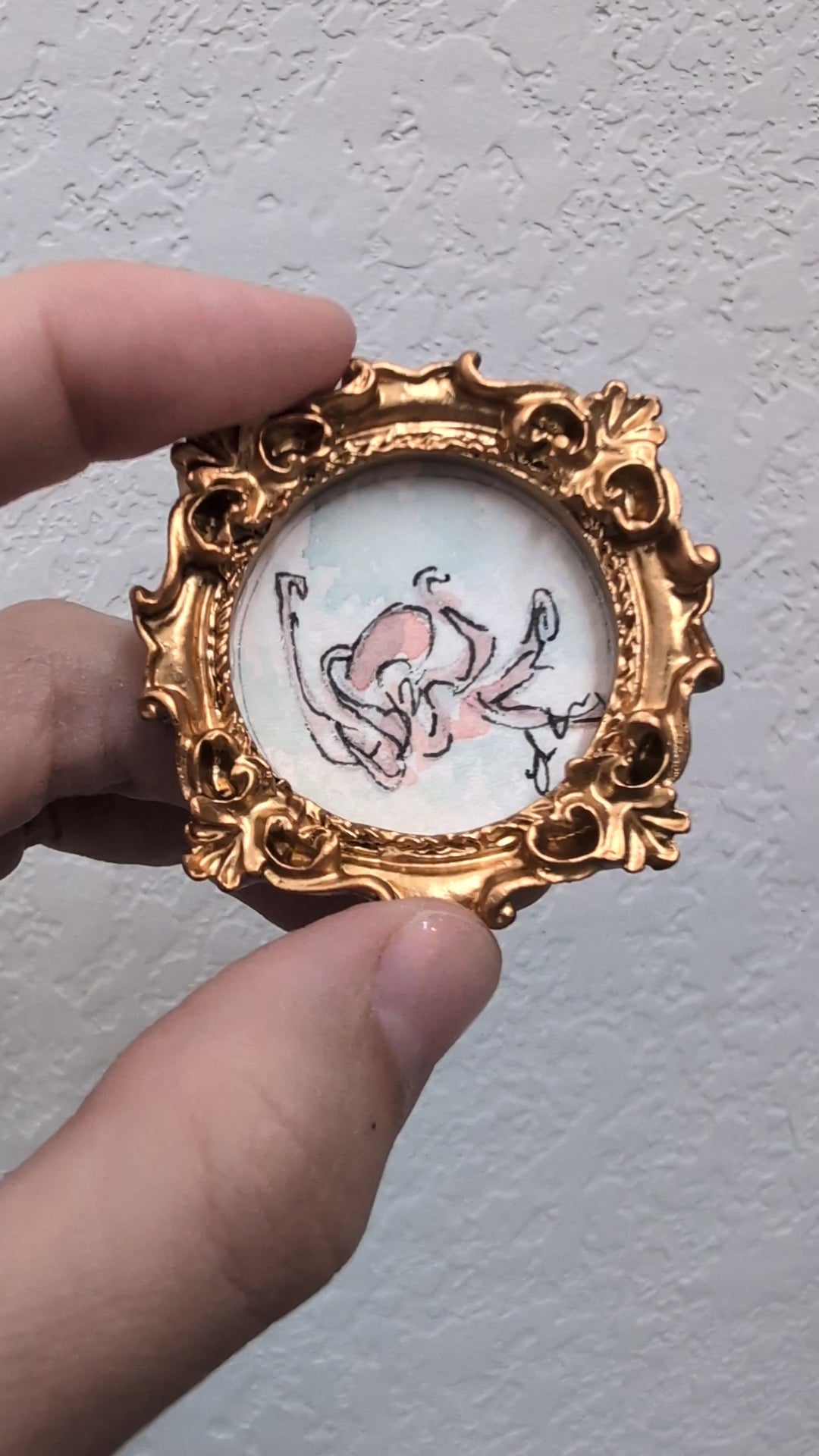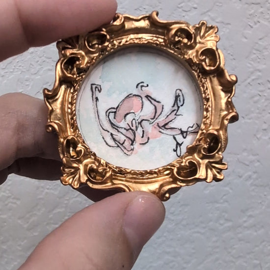 These make great gifts for any miniature enthusiast! It comes in the little gold frame, and has a tag hanger on the back.