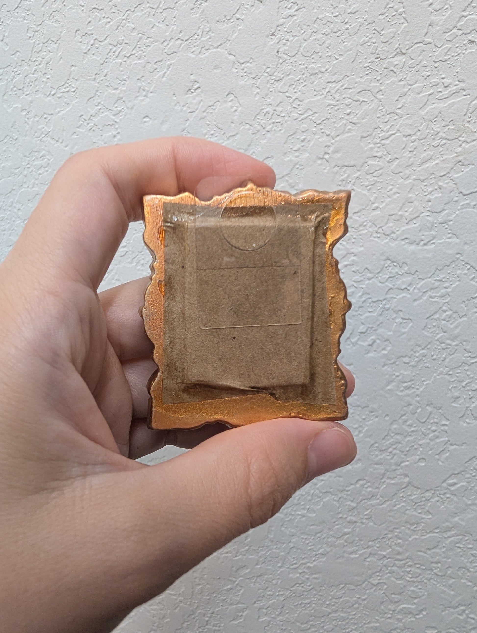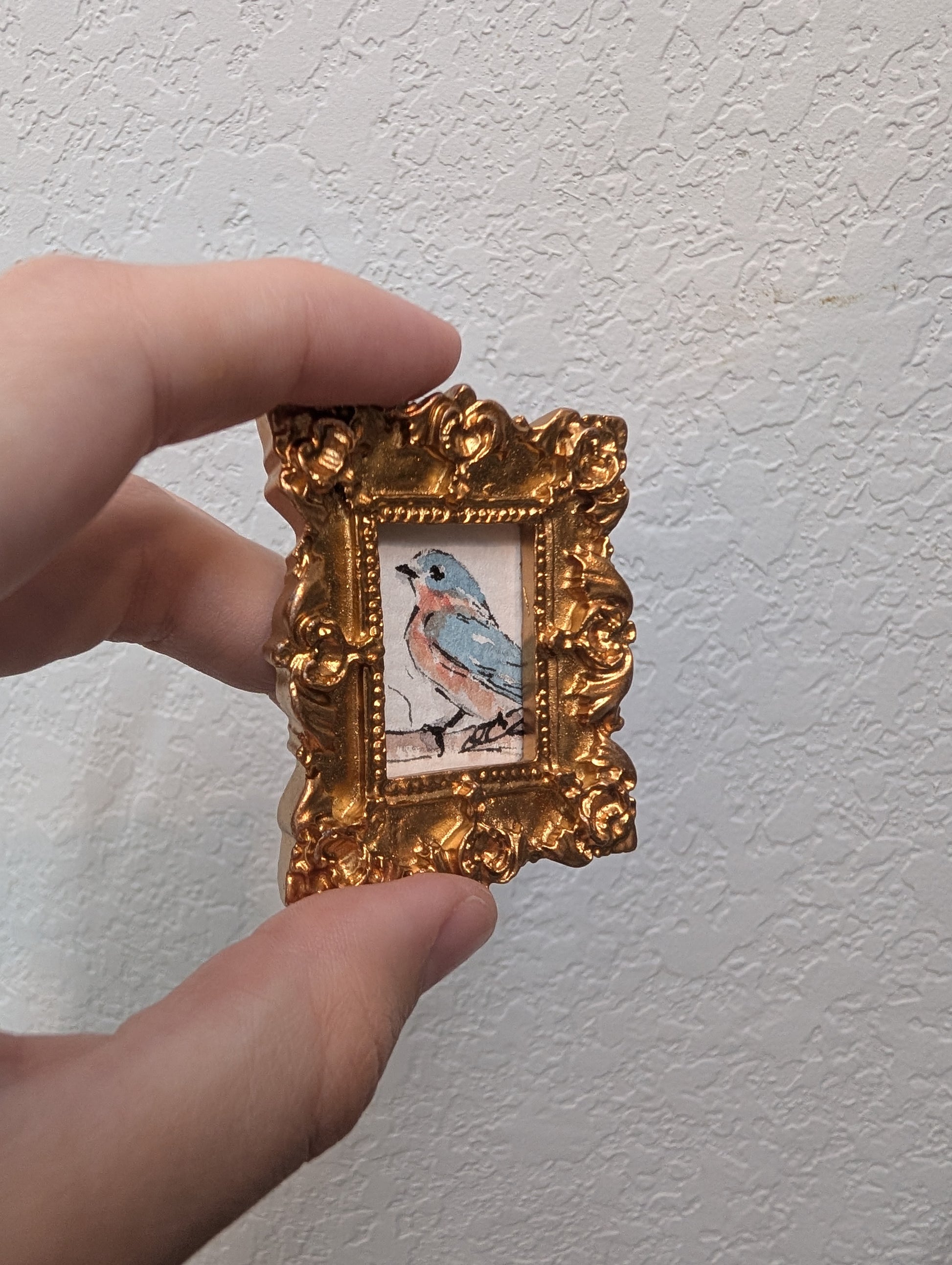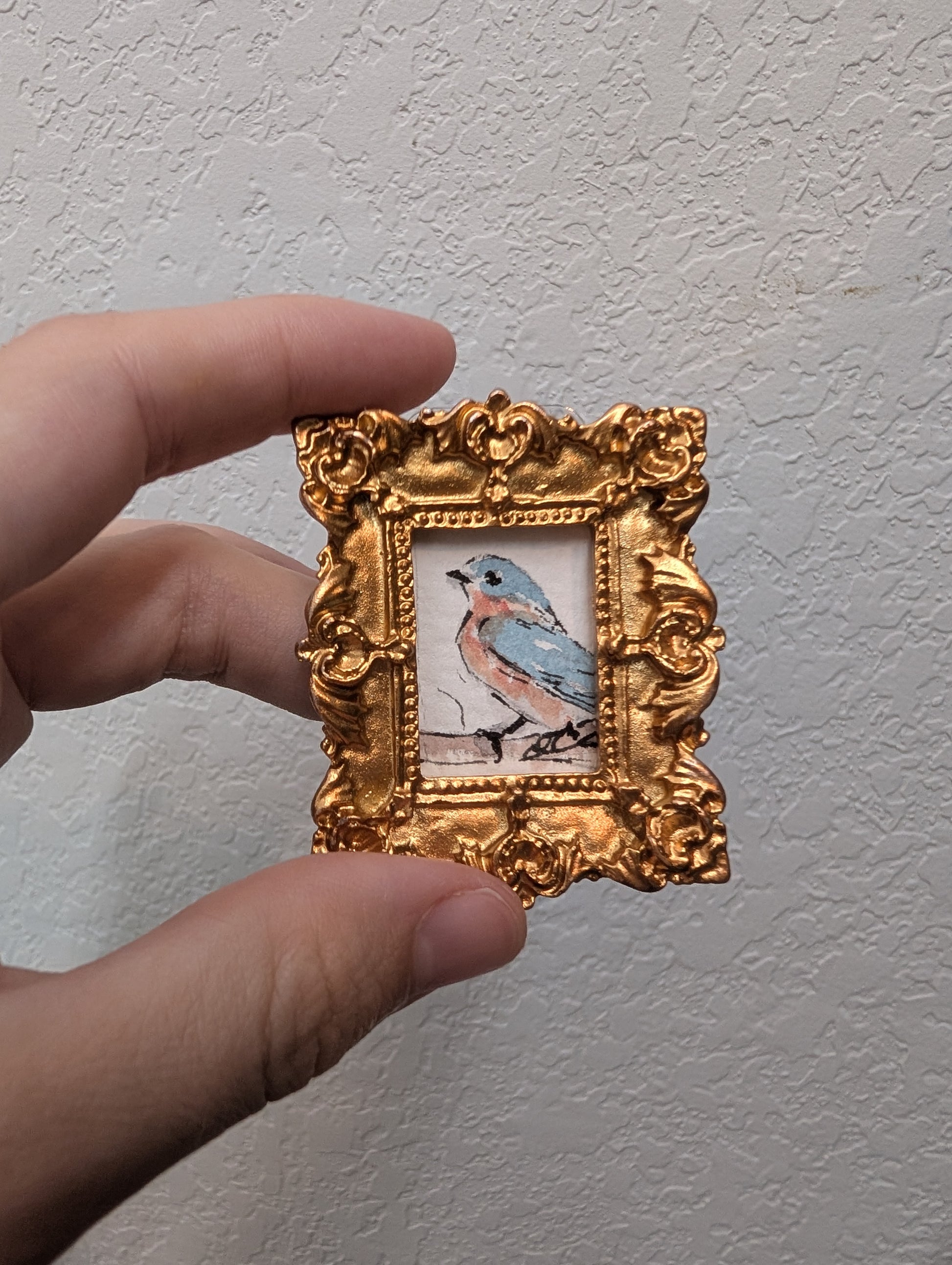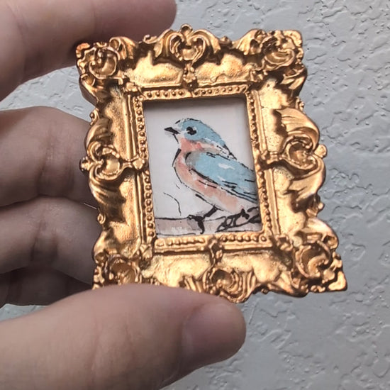 These make great gifts for any miniature enthusiast! It comes in the little gold frame, and has a tag hanger on the back.