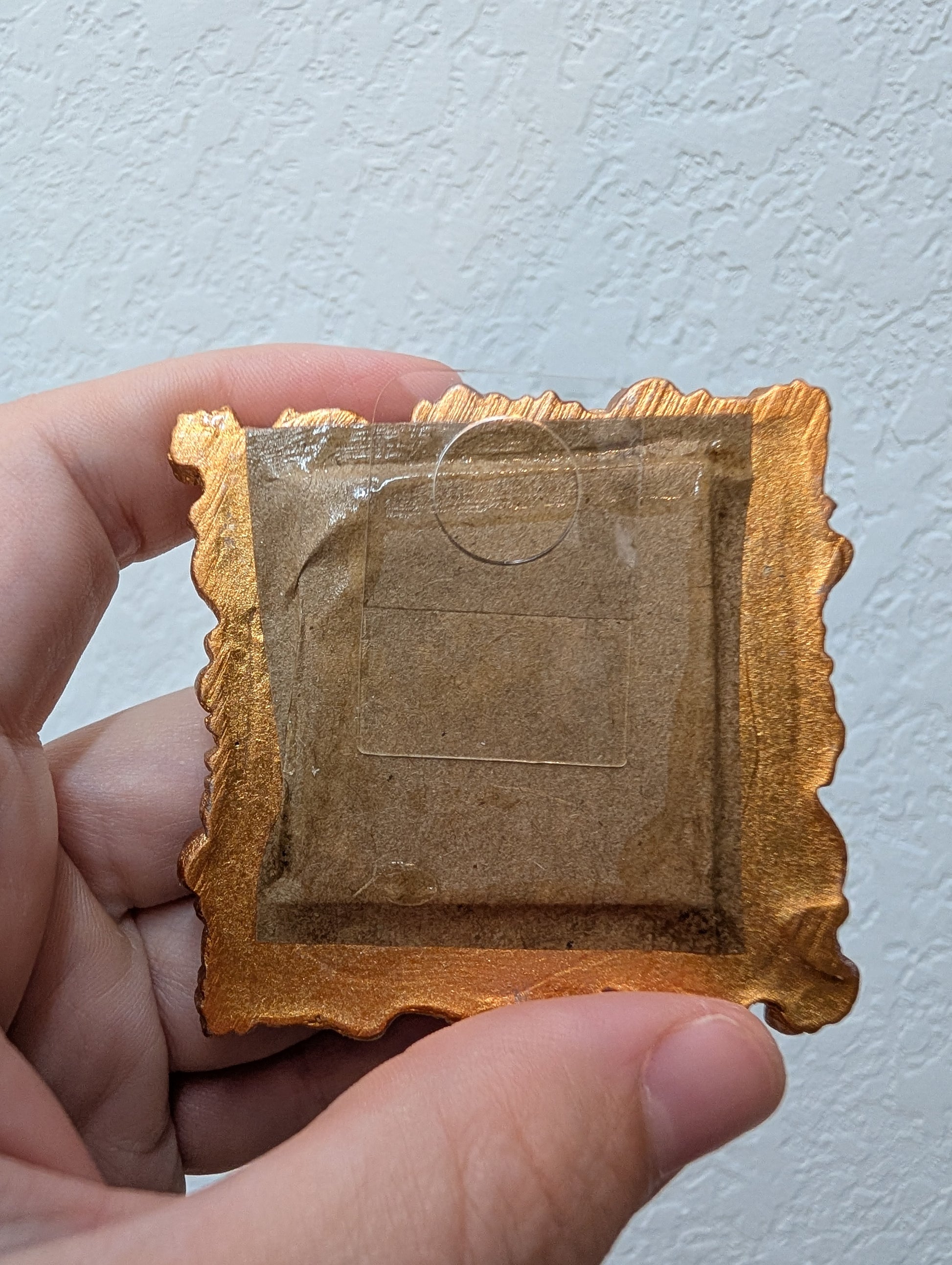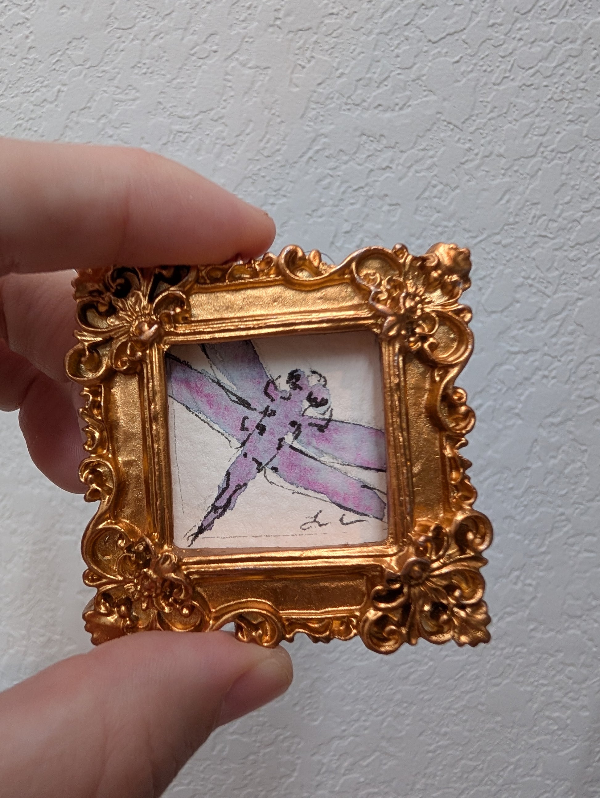 These make great gifts for any miniature enthusiast! It comes in the little gold frame, and has a tag hanger on the back.