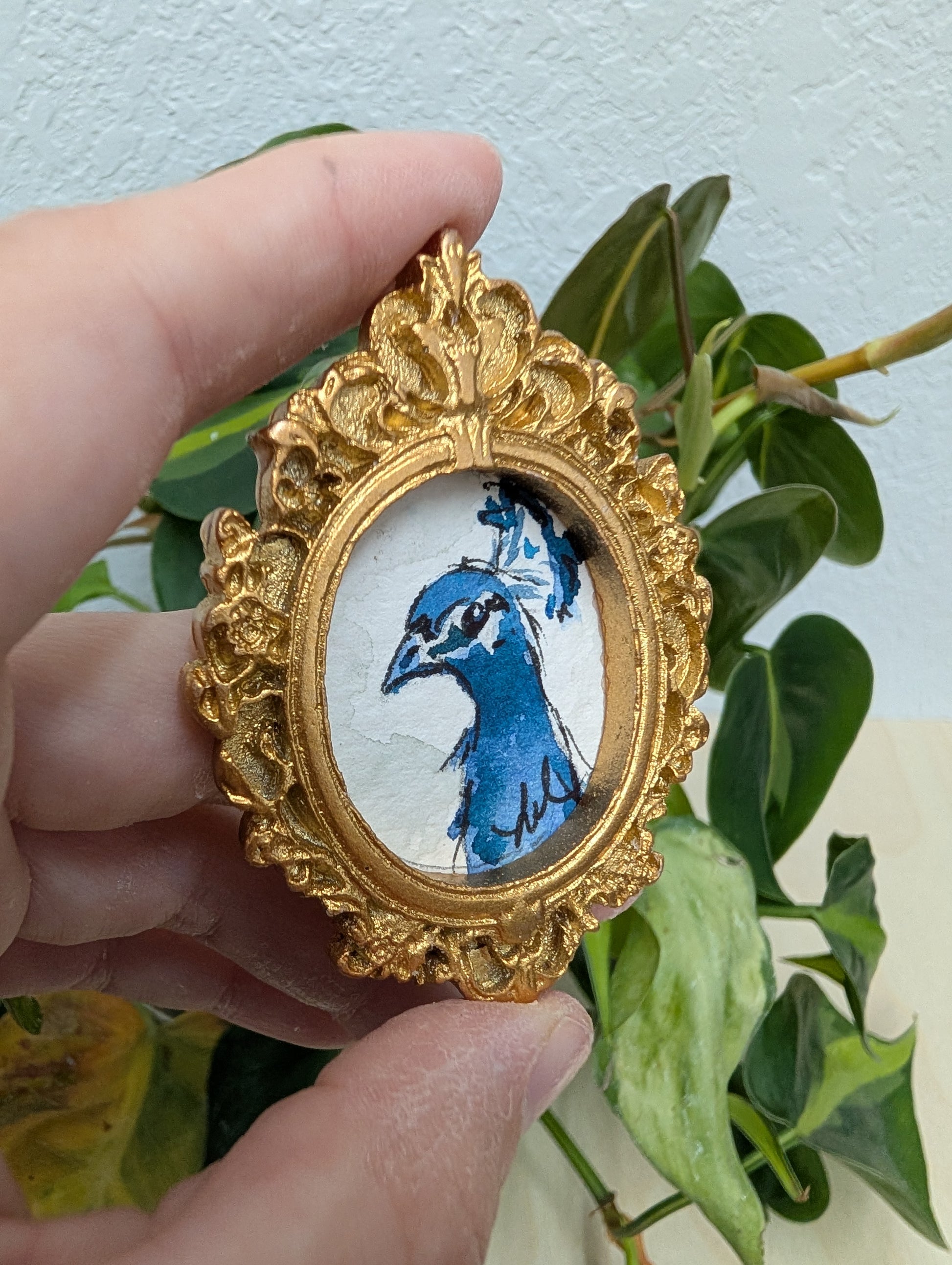 These make great gifts for any miniature enthusiast! It comes in the little gold frame, and has a tag hanger on the back.