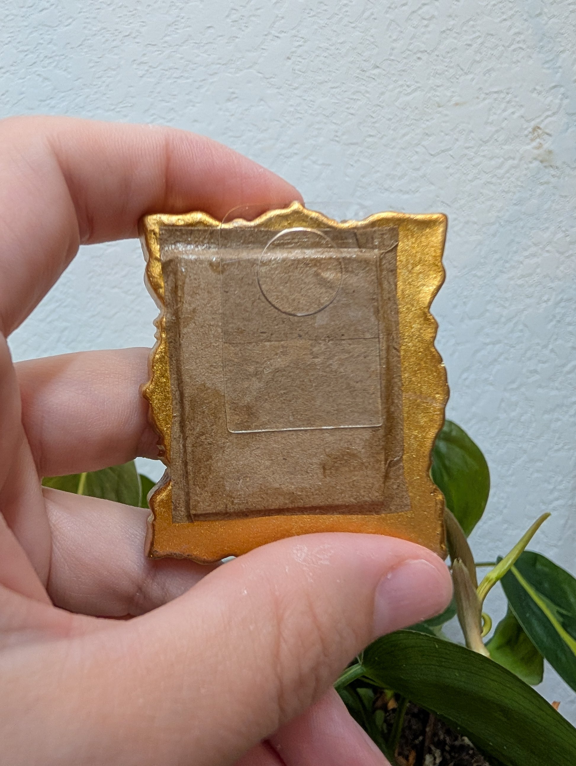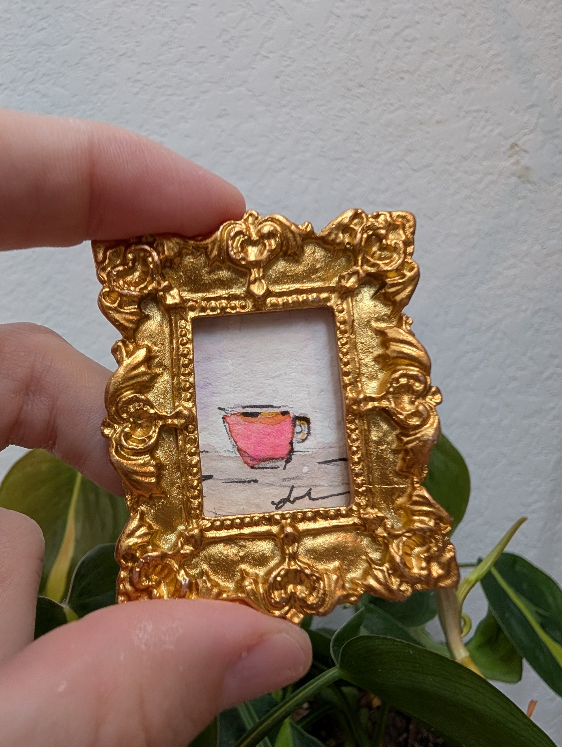 These make great gifts for any miniature enthusiast! It comes in the little gold frame, and has a tag hanger on the back.