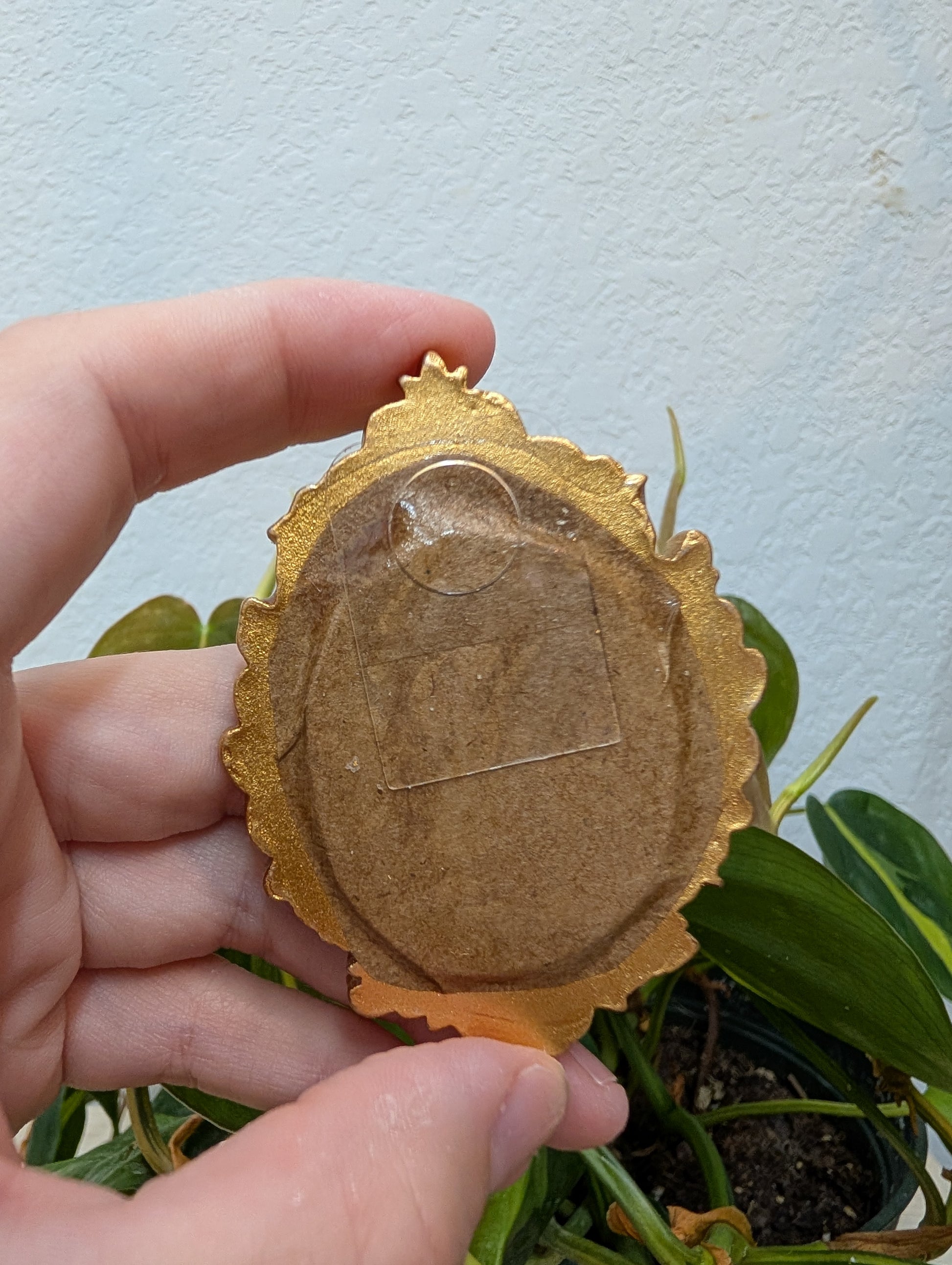 These make great gifts for any miniature enthusiast! It comes in the little gold frame, and has a tag hanger on the back.