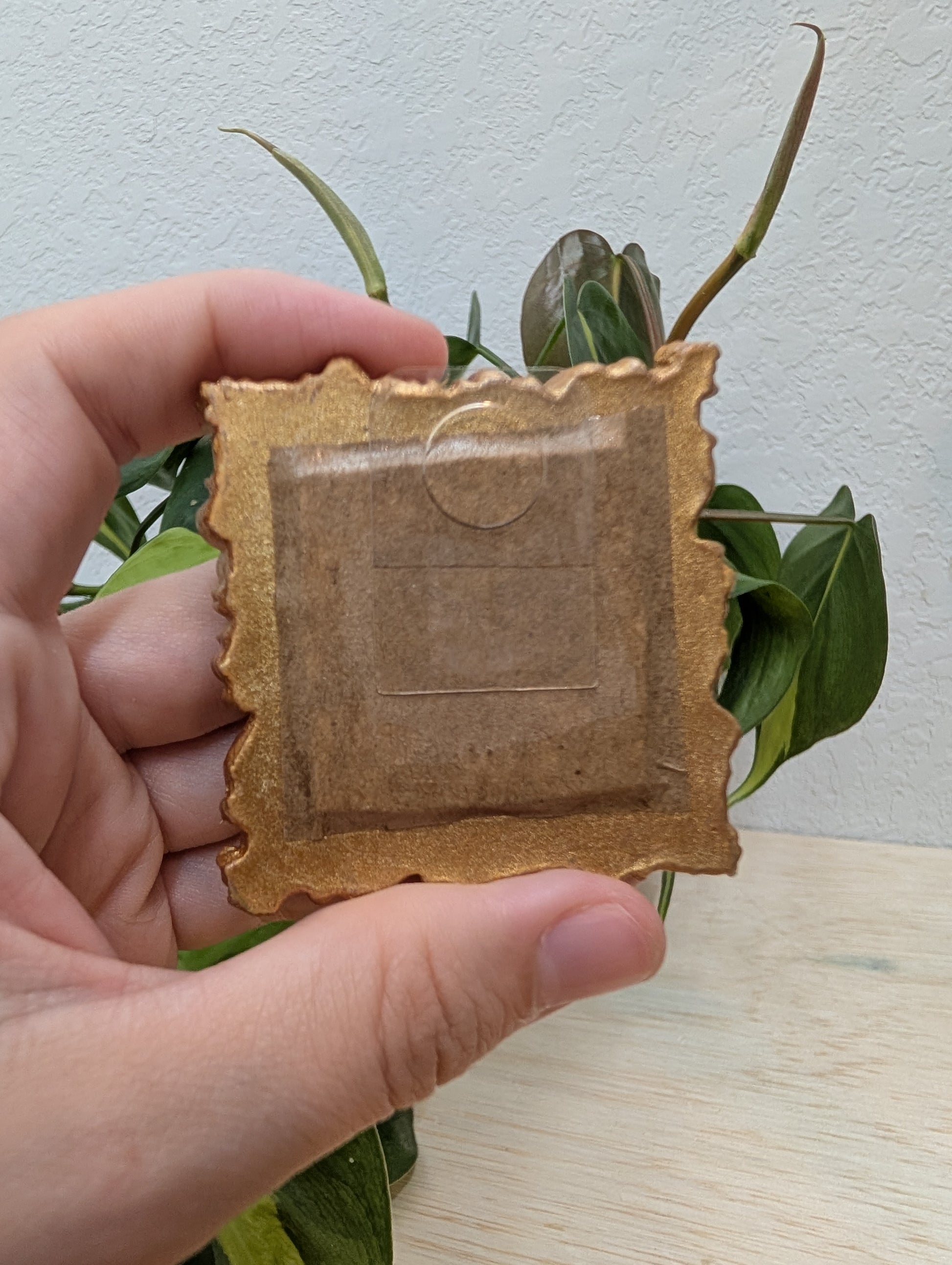 These make great gifts for any miniature enthusiast! It comes in the little gold frame, and has a tag hanger on the back.