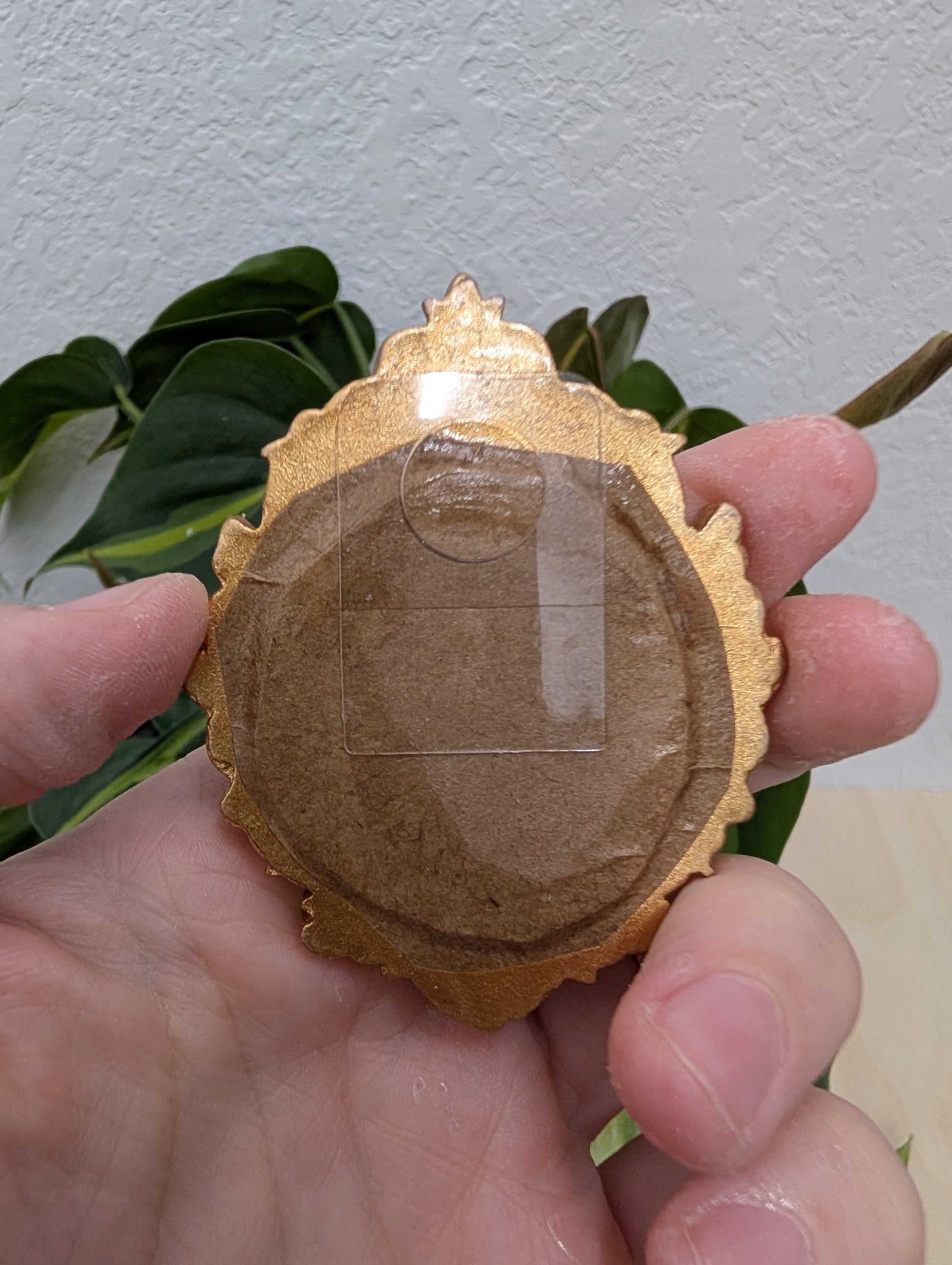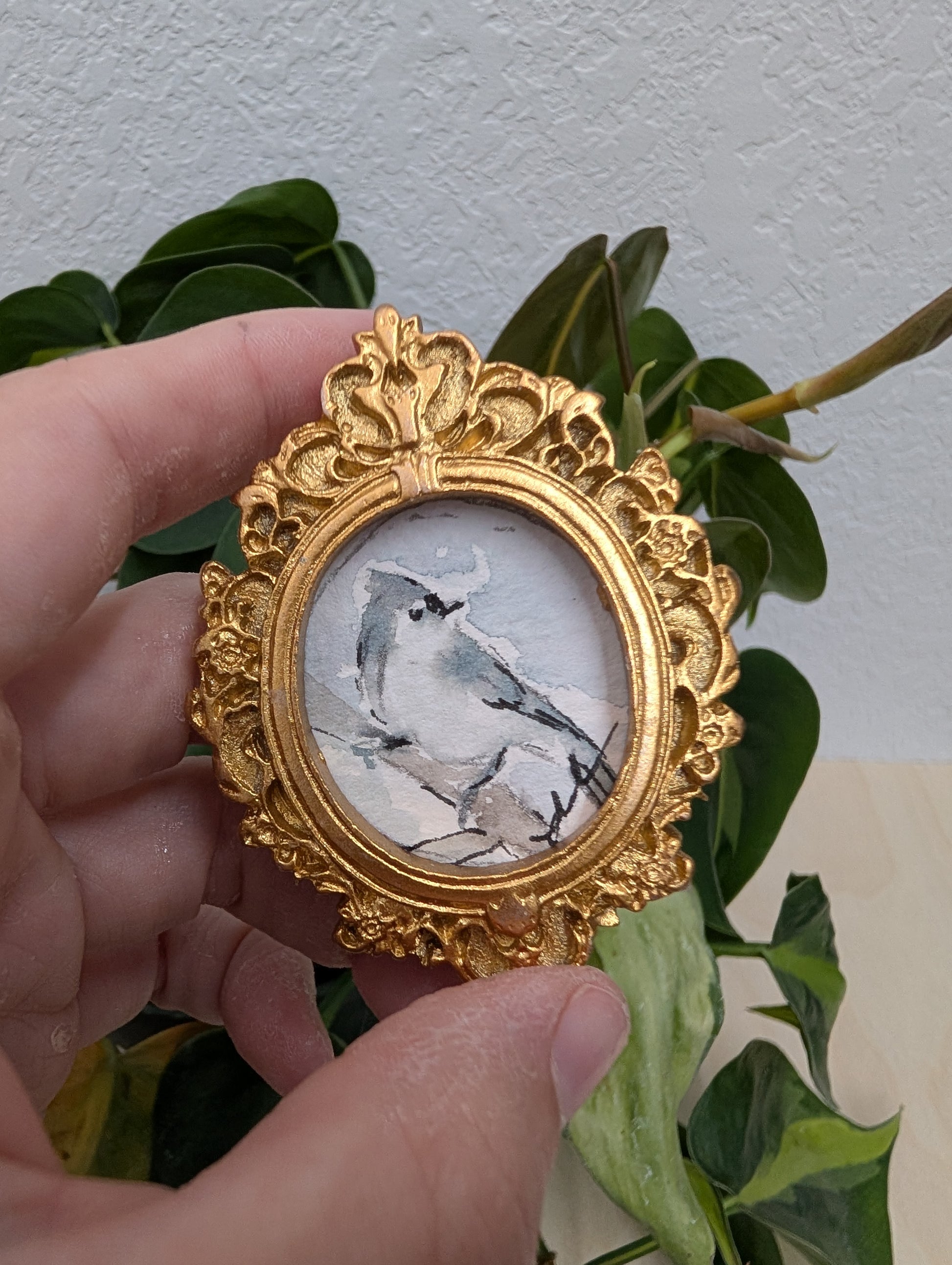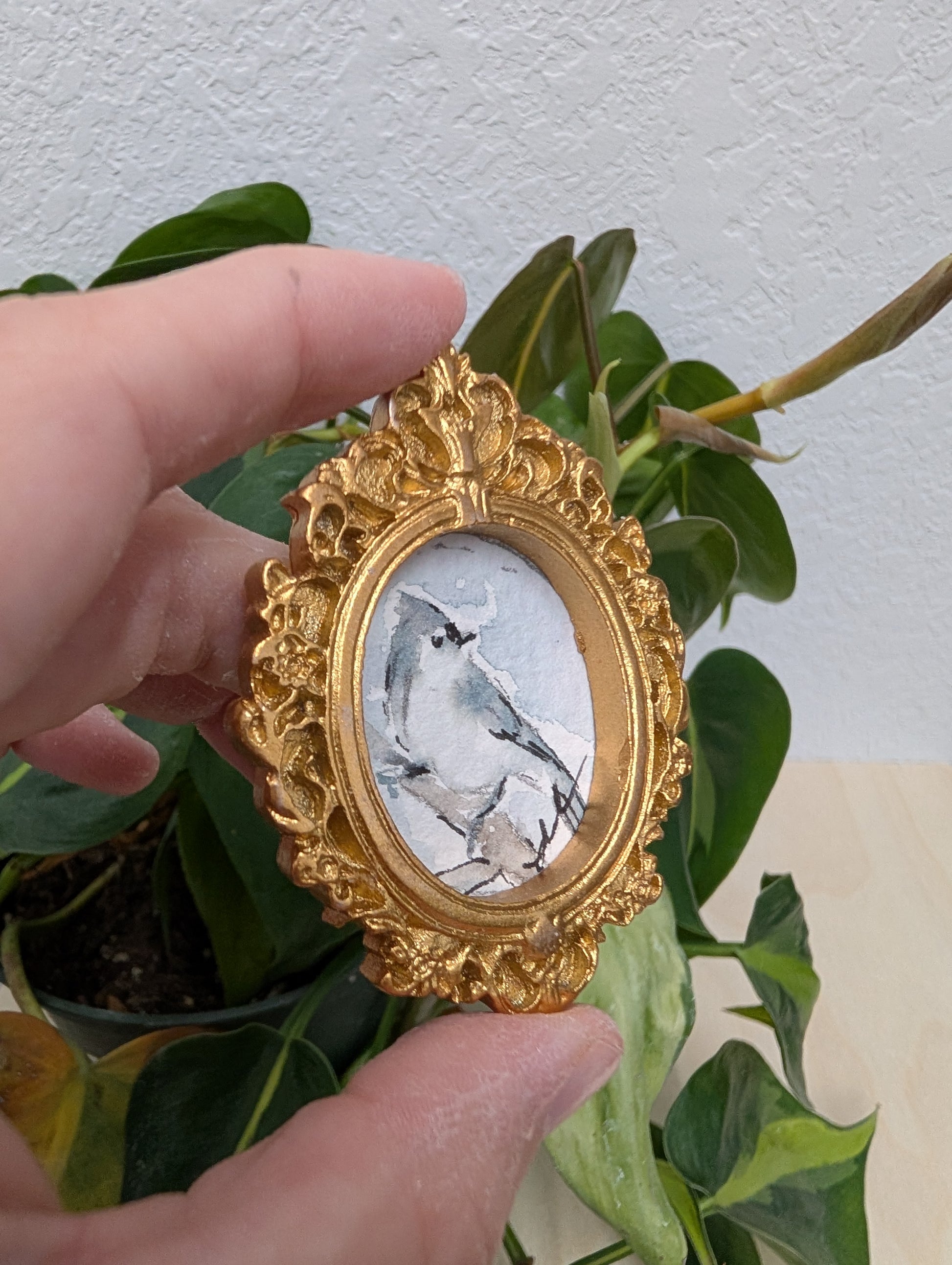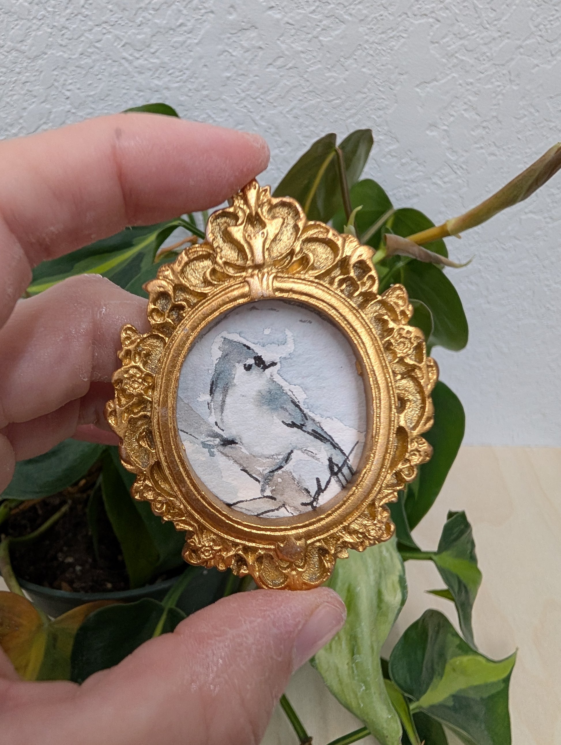 These make great gifts for any miniature enthusiast! It comes in the little gold frame, and has a tag hanger on the back.